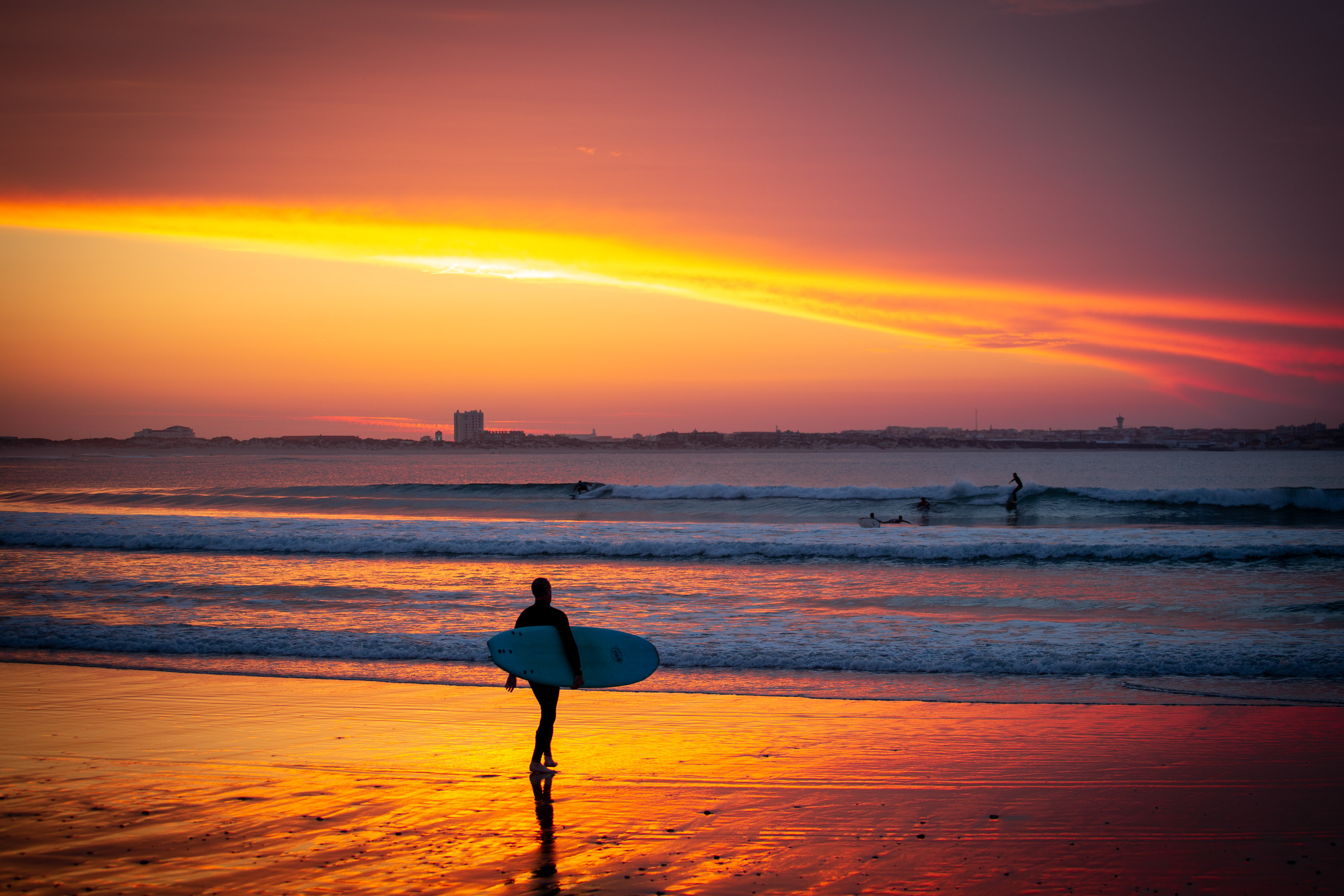 sunset surf beach silhouette magenta