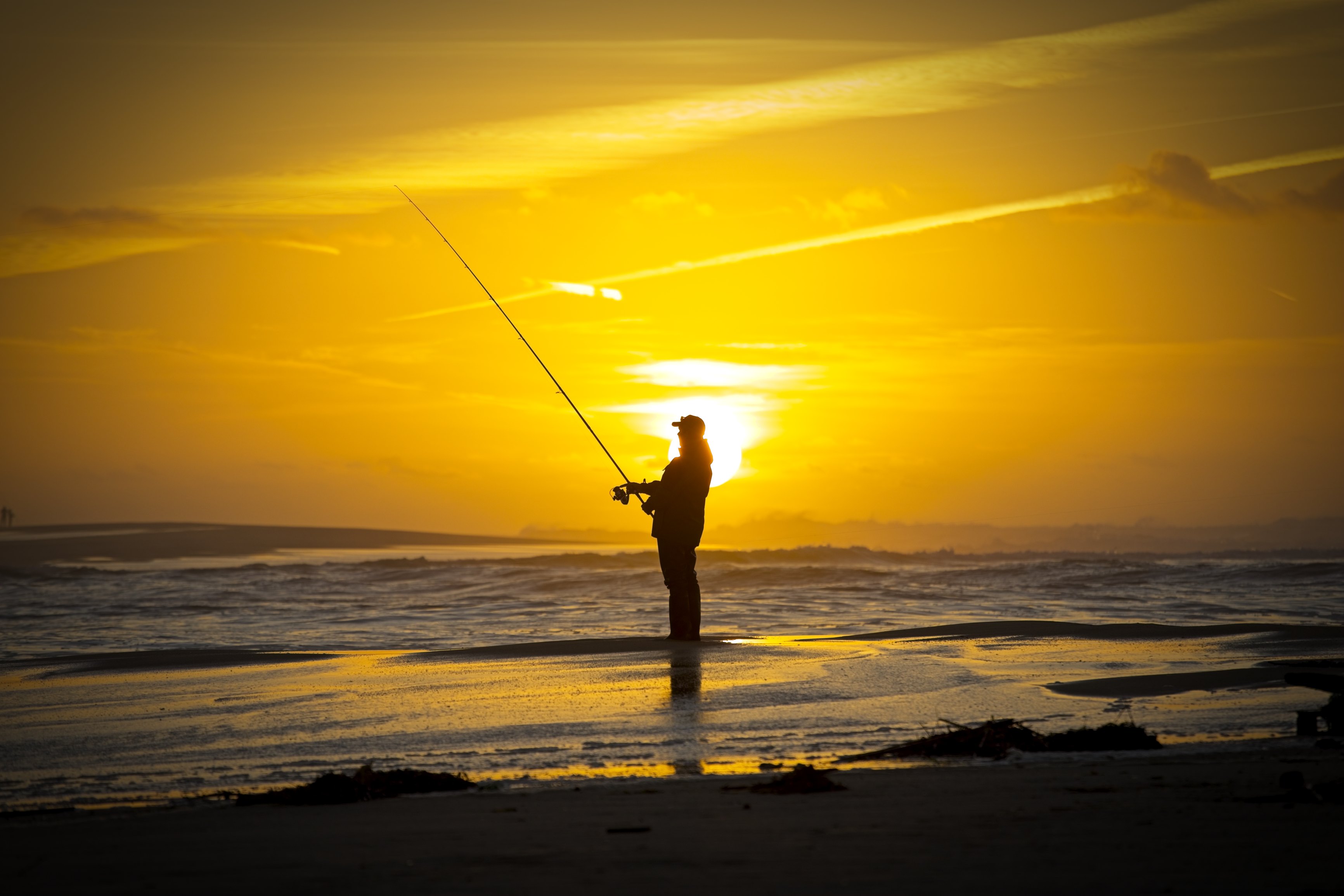 The same fisherman, a few minutes later — the waves quieter now, the wet sand catching the last light, the rod still reaching out toward the horizon.